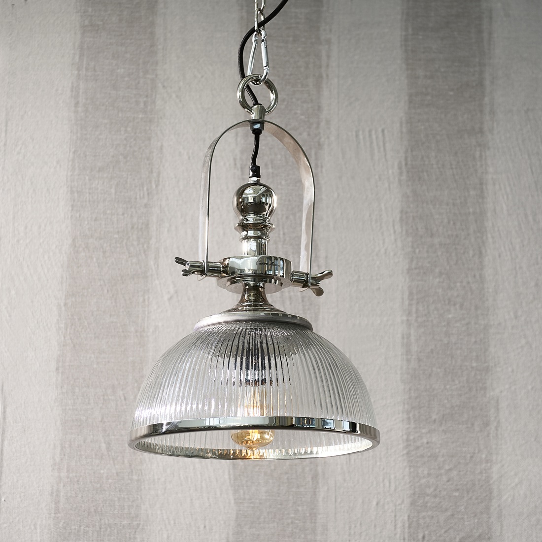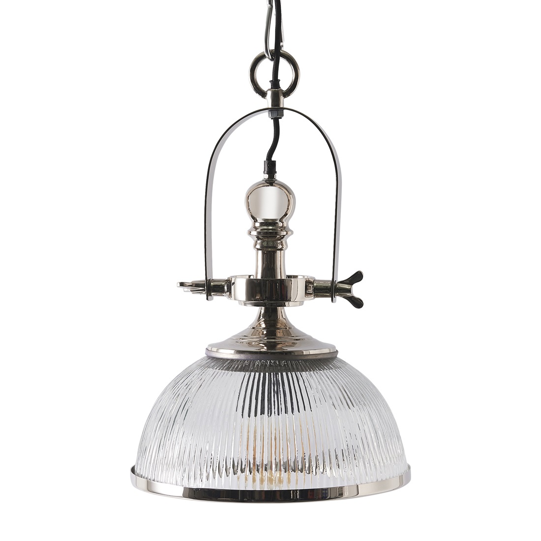 Das Design dieser Hängeleuchte ist eine spielerische Kombination aus industrieller und schicker Optik. Der halbrunde Schirm besteht aus edlem, vertikal gewelltem Glas mit einem eleganten Aluminiumrand am Boden. Das Finish auf der Oberseite macht einen robusten Eindruck. Mit der Kette kann die Lampe einfach an der Decke befestigt werden.