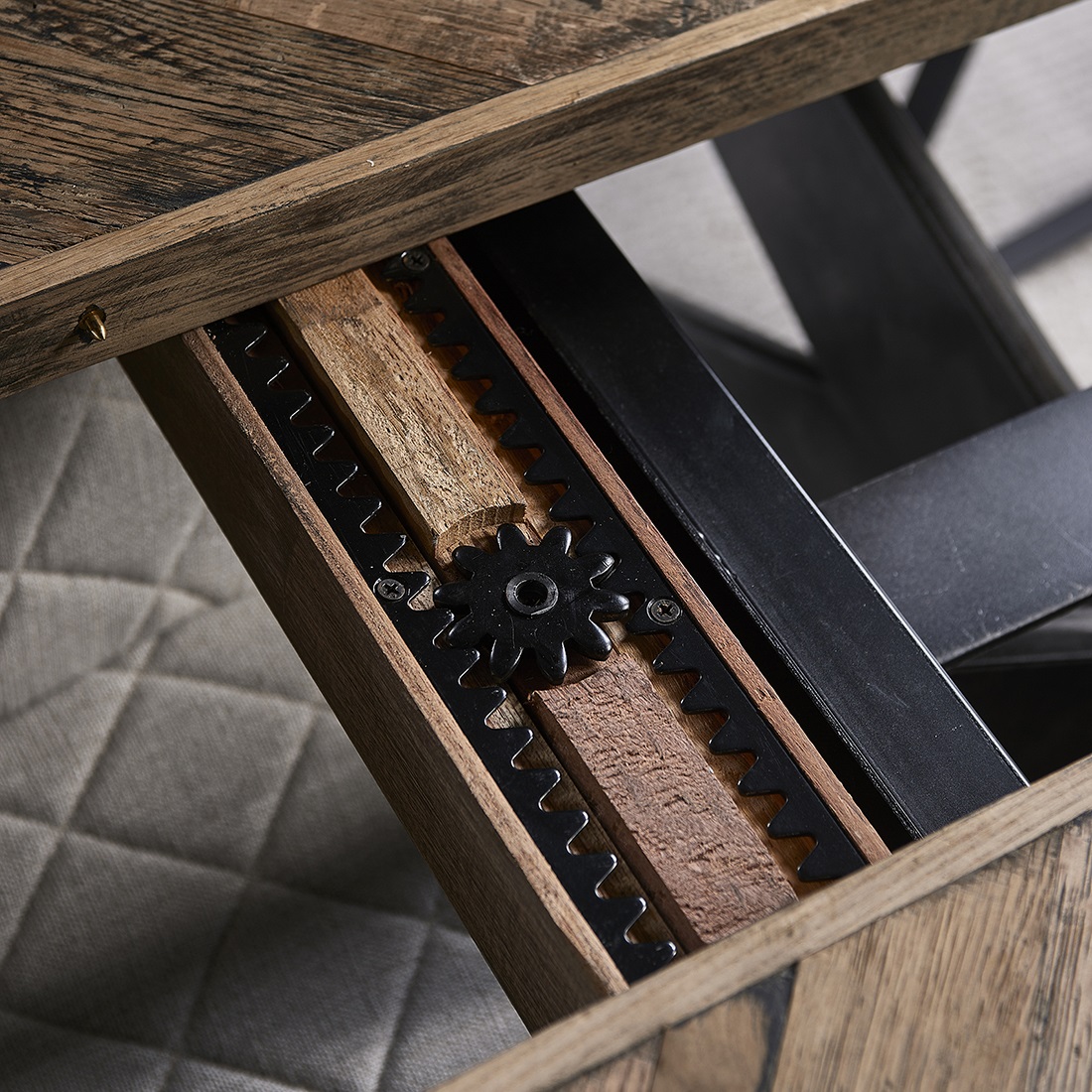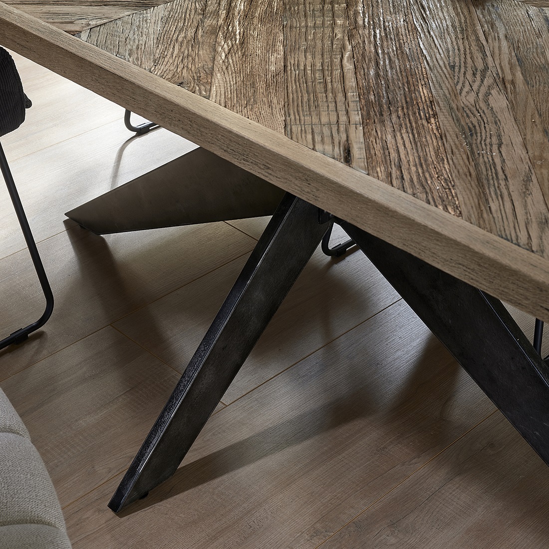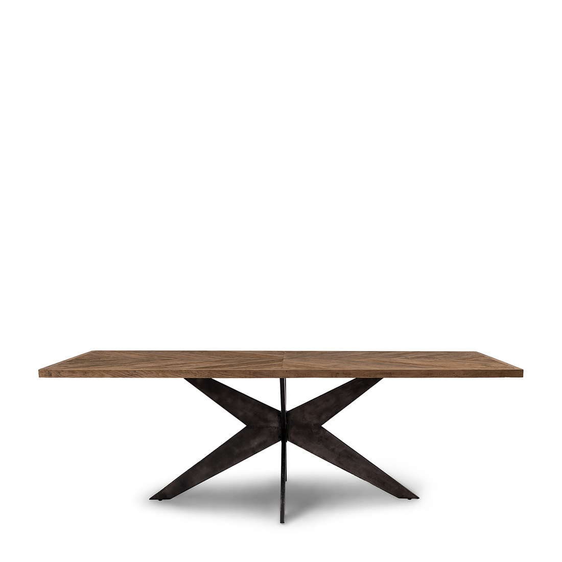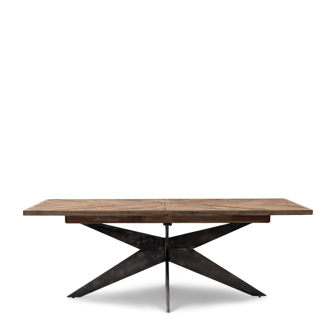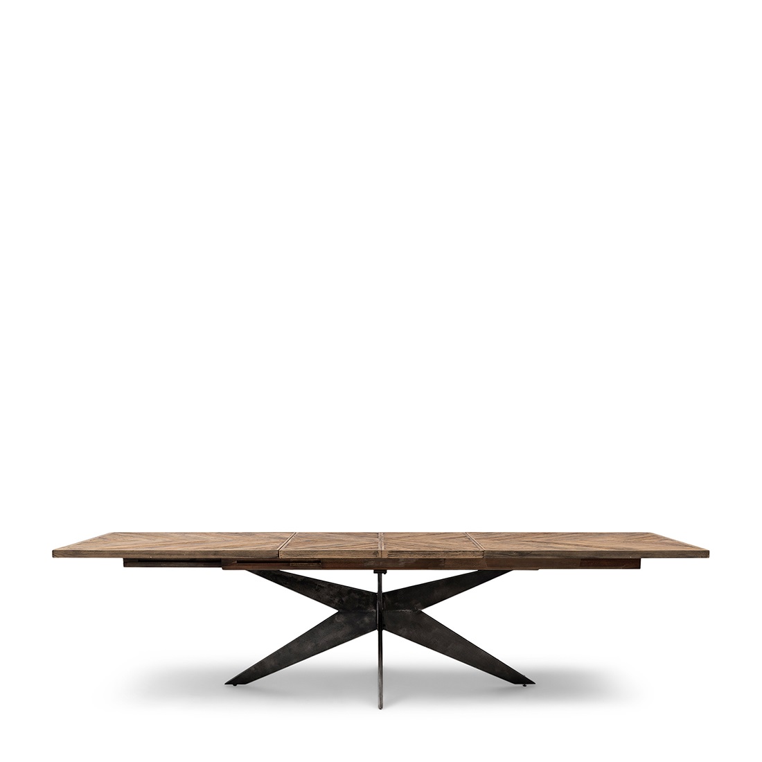 Der Falcon Crest Esstisch ist geschlossen 220 cm lang, kann aber auf 270 cm und 320 cm verlängert werden. Hergestellt aus hochwertig verarbeiteter recycelter Eiche, in schönen diagonalen Streifen. Der Rahmen und die Beine sind aus schwarzem Metall gefertigt. Es gibt nachweitere Tischgrössen von diesem Modell.