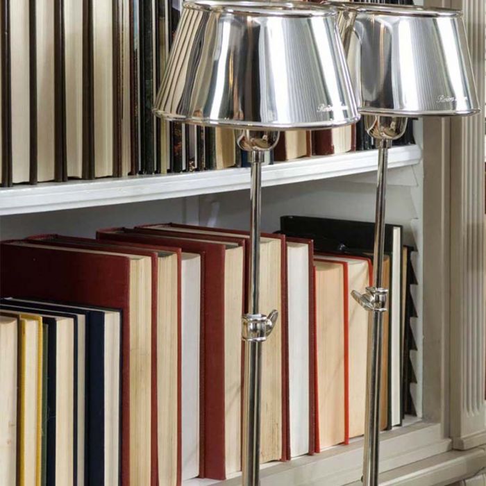 Aluminium-Tischlampe mit ovalem Lampenschirm, auf dem der Name Rivièra Maison eingraviert ist.