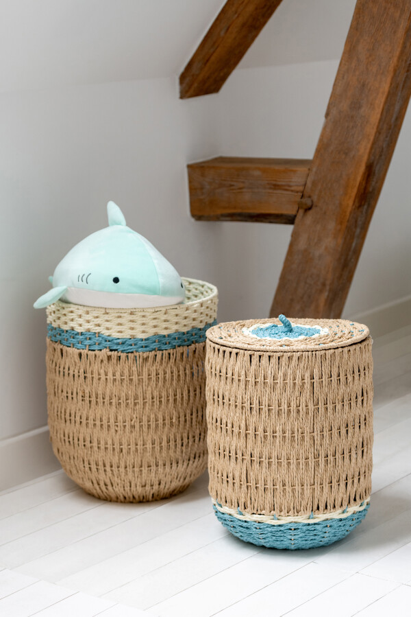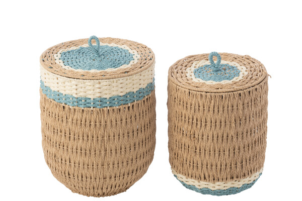 Korb Mit Deckel Gestreift Papier Naturell/Hellblau, 2 pcs. 35x35x42 / 30x30x40 by J-Line