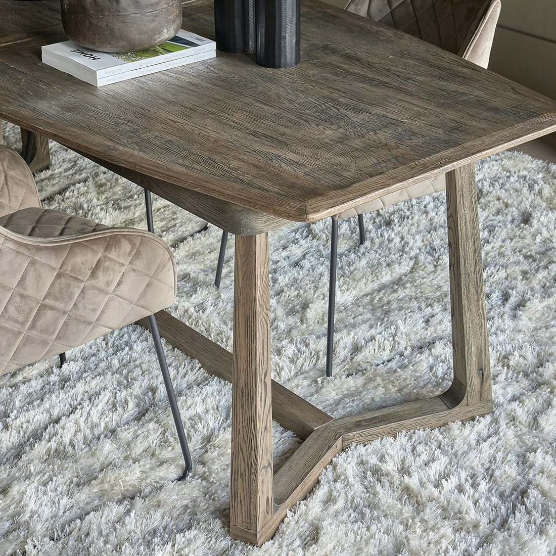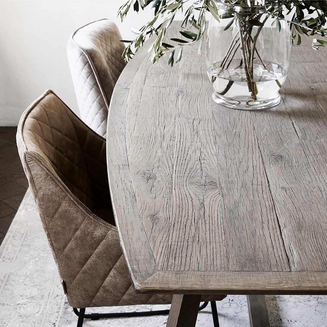 Der Miller Dining Table ist ein neues Modell eines Esstisches mit runden, organischen Formen. Diese sind sowohl in der Tischplatte als auch im Gestell zu finden. Die vier Tischbeine fügen sich zu einem stabilen Gestell zusammen. Die Tischplatte ist aus recyceltem Eichenholz und das Gestell aus neuem Eichenholz gefertigt.