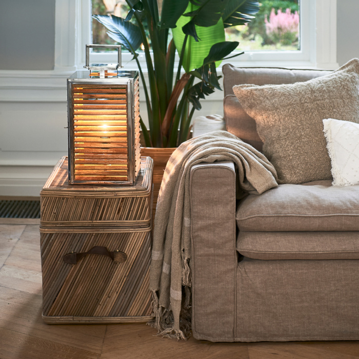 Die Shutters Tischleuchte silber ist eine schöne Tischleuchte, die mit Fensterläden versehen ist. Die Leuchte besteht aus einem silbernen Aluminiumrahmen mit hölzernen Fensterläden an der Oberseite. Die Lampe hat eine E27-Fassung und ein schwarzes Kabel mit Schalter.
