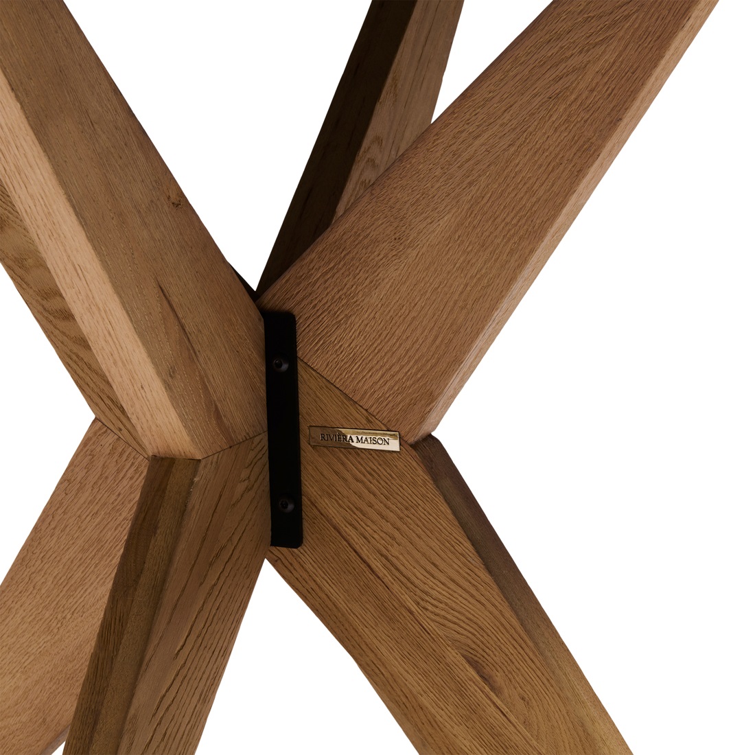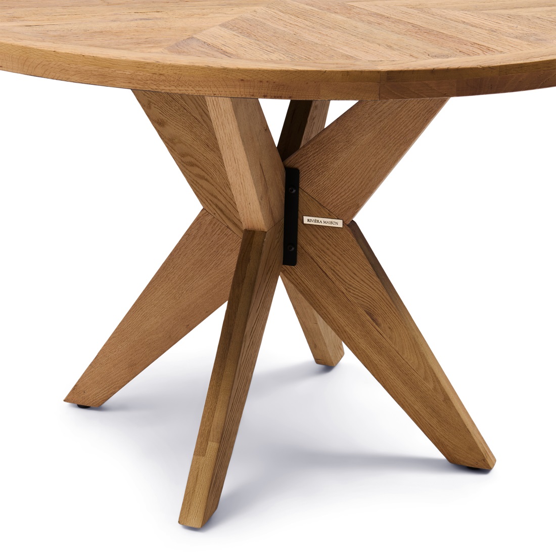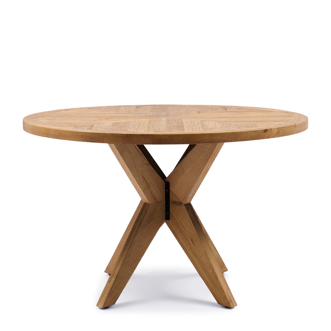 Der Portland Esstisch ist ein robuster, runder Esstisch. Die Tischplatte besteht aus aufgearbeiteter, eingelegter recycelter Eiche in einer ungarischen Spitze. Das Holz ist in Textur und Farbtönen sehr unterschiedlich. Der gekreuzte Sockel dieses Esstisches ist ebenfalls aus massiver Eiche gefertigt. Der Esstisch ist auch in einer weiteren runden Form von Ø 1.50 sowie in der rechteckigen Version von 2.30m erhältlich.
