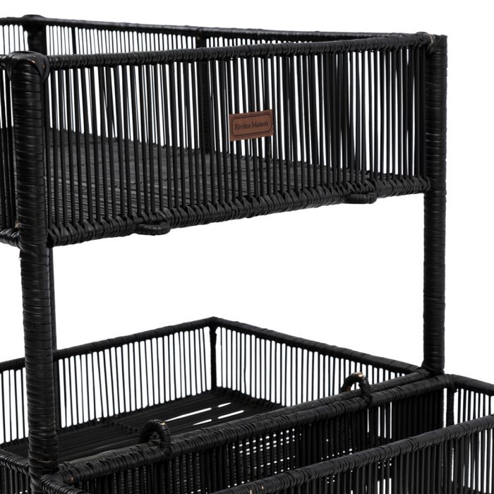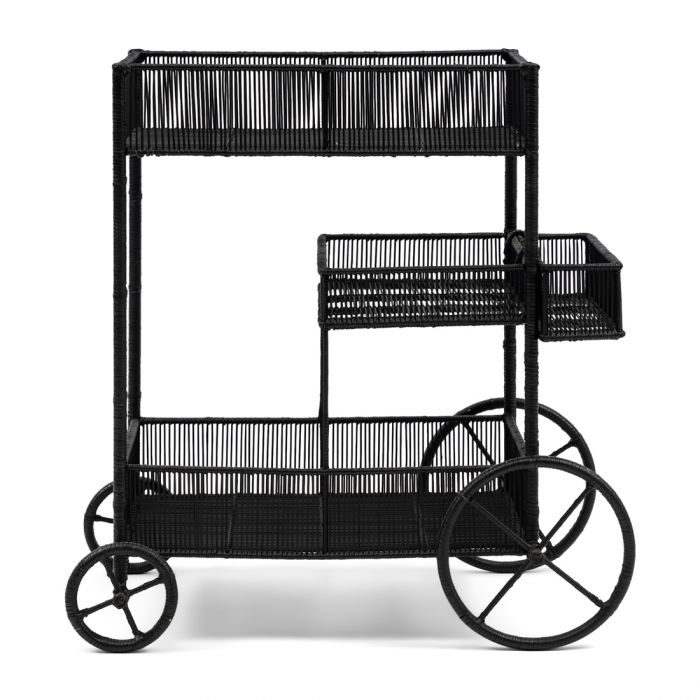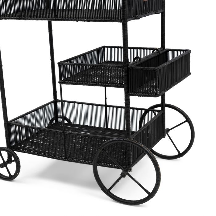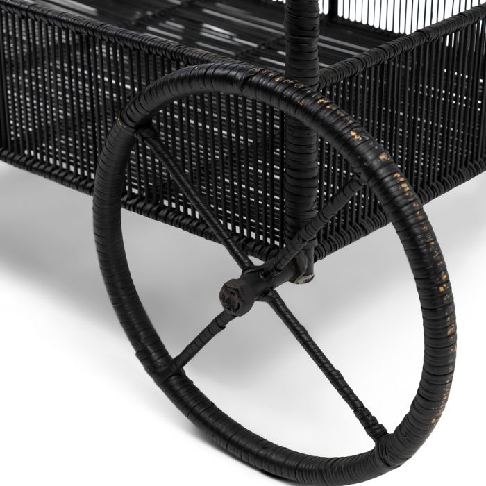 Entzückender Servierwagen aus schwarzem Rattan, kunstvoll in eine kleine Hausbar verwandelt. Genug Platz für Ihre Lieblingsgetränke und schönsten Gläser. Der Servierwagen ist selbstverständlich handgefertigt, genau wie die anderen kleinen Möbel von Punta Cana.