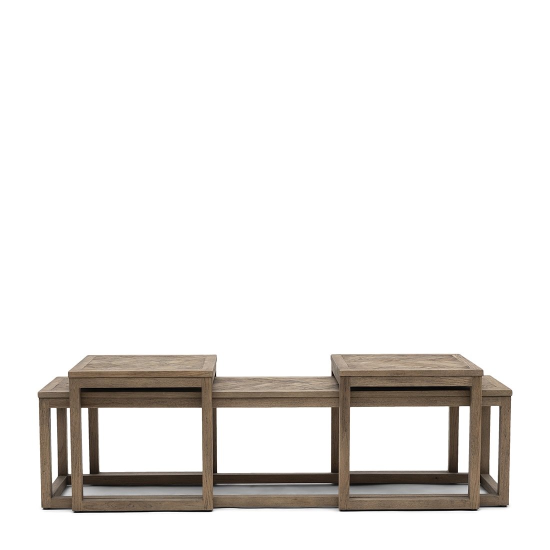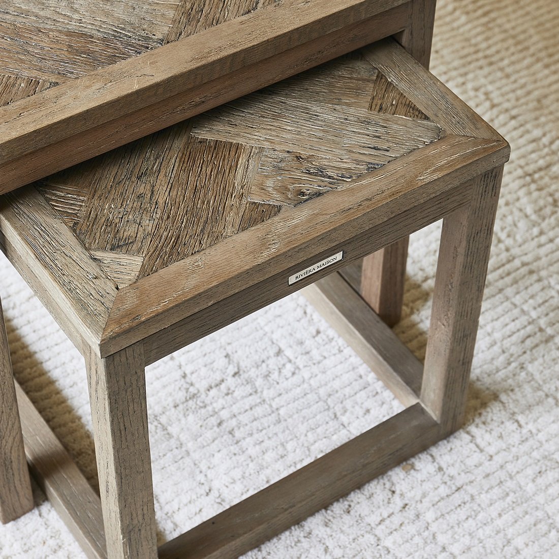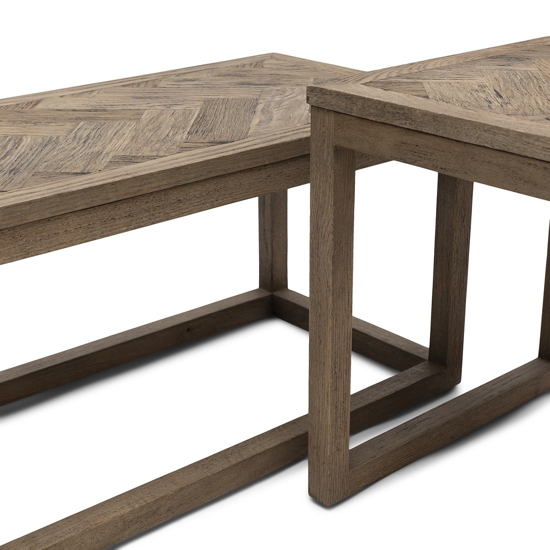 Dieses Tischset aus der Harbour Island-Linie besteht aus 3 Tischen. Sie können einzeln oder zusammen verwendet werden. Nutzen Sie den langen Tisch als Couchtisch und stellen Sie die kleineren Teile neben das Sofa, um Ihr Getränk darauf abzustellen. Die Tische sind aus Eichenholz im Fischgrätenmuster gefertigt.