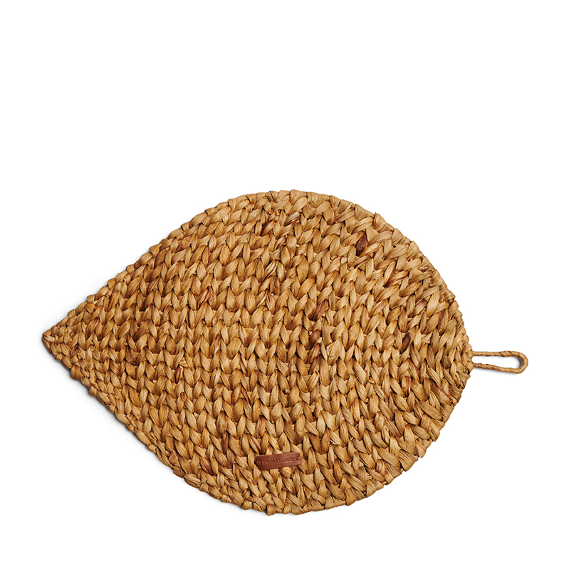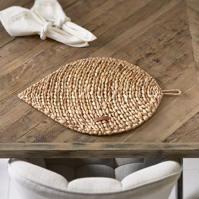 Geflochtene Bananenblätter in Rundbögen bilden die Basis dieses stilvollen blattförmigen Tischsets. Wenn kein Essen auf dem Tisch steht, für das Sie dieses Tischset verwenden möchten, hängen Sie es an der Öse an die Wand, und es wird garantiert ein Blickfang sein.