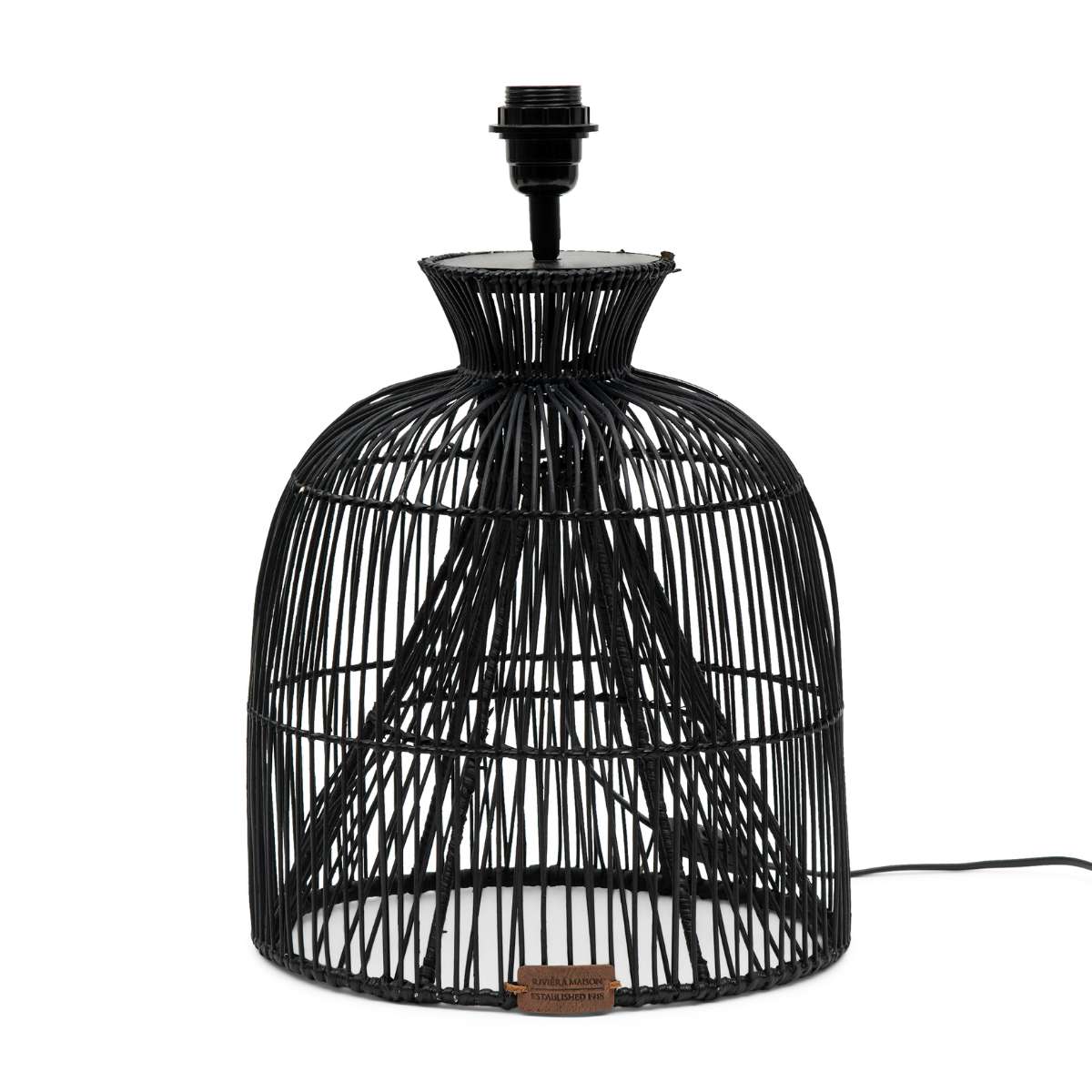 Dieser Lampenständer aus schwarz lackiertem Rattan hat die Form eines Fischkorbs, in dem eine Reuse die imaginären Fische am Zurückschwimmen hindert. Der Lampensockel besteht aus zwei Schichten Rattan, die von Hand zu dieser einzigartigen Lampe geflochten wurden. An der Unterseite des Sockels ist ein Lederetikett mit dem Rivièra Maison-Branding angebracht.