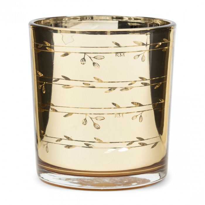 Mit diesem goldenen Kerzenständer setzt du einen stimmungsvollen Akzent in deiner Einrichtung. Das Glas ist mit einem goldenen Aufdruck versehen, der für einen eleganten und festlichen Look sorgt. Perfekt, um ein warmes und gemütliches Ambiente zu schaffen.