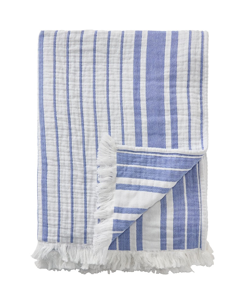 Verleihen Sie Ihrem Zuhause mit dieser weichen, garngefärbten, gestreiften Decke in Blau und Weiß einen zeitlosen Stil. Das Modell mit weichen Fransen an den kurzen Seiten ist aus 100 % Bio-Baumwolle gefertigt und sowohl Oeko-Tex- als auch GRS-zertifiziert. Es ist Teil unserer Sommerkollektion und wird durch ein gewebtes Lexington-Logoetikett in der unteren vorderen Ecke vervollständigt. Perfekt zum Überziehen oder für einen gemütlichen Sommerabend.