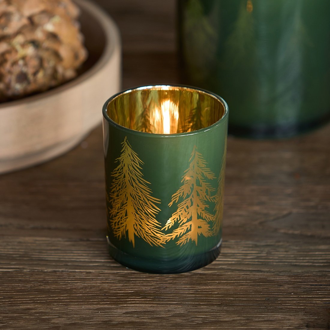Der Teelichthalter Winter Forest ist eine raffinierte Ergänzung für dein Interieur. Das winteliche Design mit dem transparenten Tannenmuster und die goldene Innenseite sorgen für ein warmes Licht. Kombiniere diesen Teelichthalter perfekt mit der größeren Variante für ein stimmiges und elegantes Gesamtbild in deinem Raum.